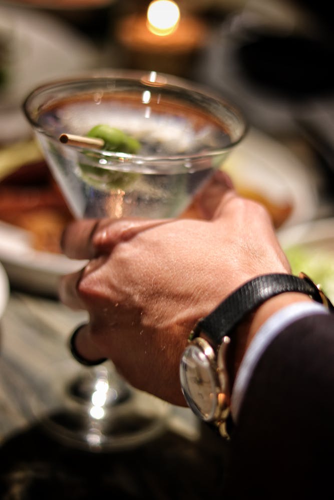 Ketel One vodka or Blue Coat gin, Dolin dry vermouth rinse, Point Reyes blue cheese stuffed Castelvetrano olives